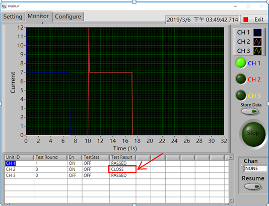 測試軟件也加入了一個特別的功能,當異常的繼電器被更換成下一個正常的繼電器后,程序可以繼續執行測試,被更換的繼電器測試數據會重新累計,而沒被更換繼電器測試數據會繼續累計計算。此功能可透過程序中的 Chan 及 Resume 來執行達成